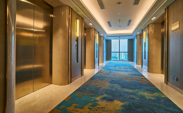 4th Floor Elevator Corridor || Floor : Marble - Crema Valley | Wall : Marble - Crema Valley | Jamb Lift : Marble - Calacata Bruchetto